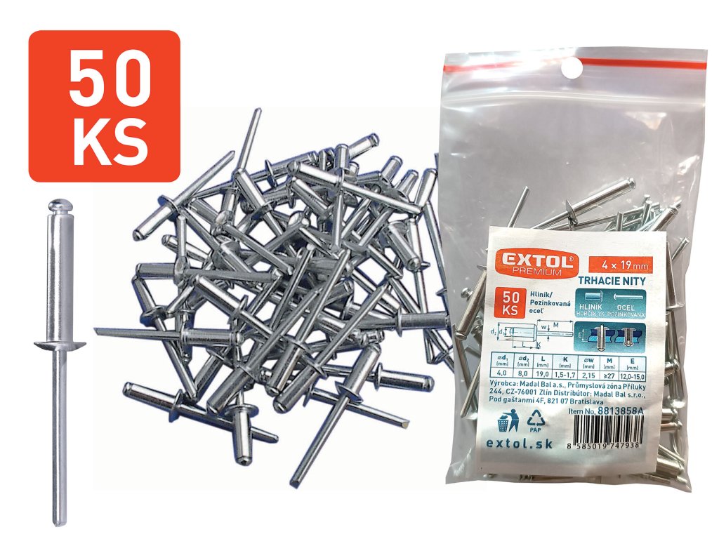 › Ručné náradie › Kliešte › Nitovacie kliešte › Nity trhacie hliníkové 4,0x19mm 50ks, EXTOL PREMIUM
