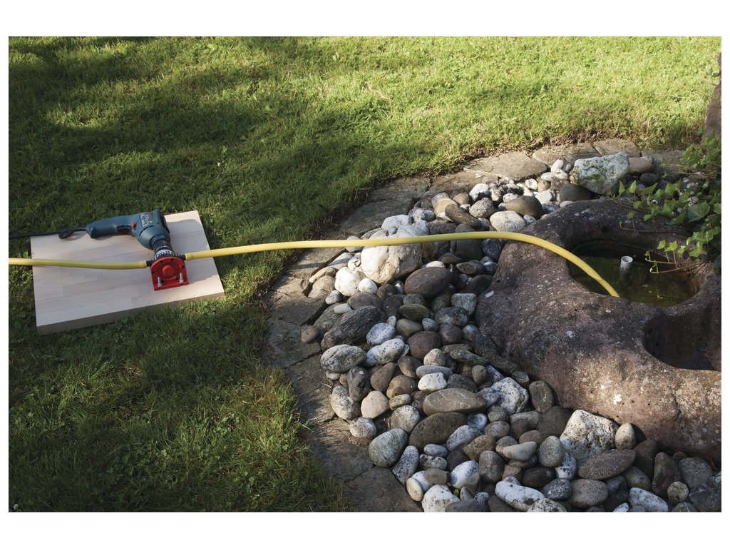 Pripojte hriadeľ k vŕtačke a pripojte záhradnej hadice k príslušným spojom.