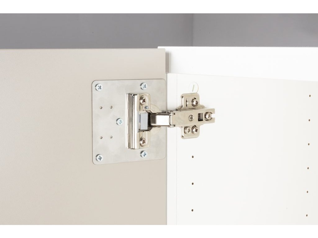 Umiestnite misku závesu do montážnej dosky a vložte ju do vytrhnutého otvoru na dverách. Pomocou samocentrovacieho vrtáka na závesy pripravte skrutkový spoj v 5 otvoroch pre skrutky v oceľovej doske. Nástroj zabezpečí presné dodržanie uhla 90° pri vertikálnom predvŕtavaní. Panel sa potom môže priskrutkovať na miesto. Po upevnení montážnej dosky pripravte závesný skrutkový spoj. Vložte samocentrovací vrták do otvorov pre závesné skrutky a predvŕtajte materiál dverí. Nakoniec nastavte posledné 2 skrutky a záves je opravený a funkčný.