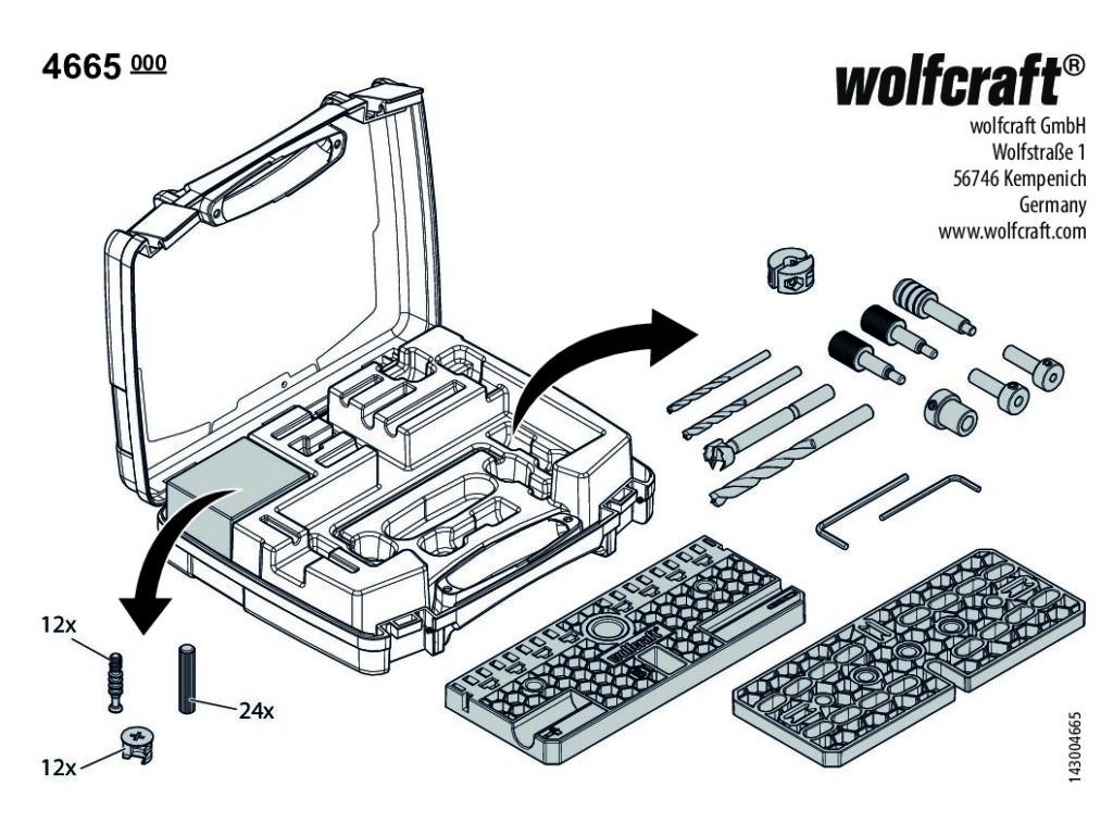Praktický kufrík obsahuje dvojdielnu vŕtaciu šablónu z kvalitného plastu a všetky potrebné vrtáky s hĺbkovou zarážkou pre vŕtanie s obmedzenou hĺbkou. Súčasťou súpravy sú aj spoje nábytku a kolíky v dostatočnom množstve.