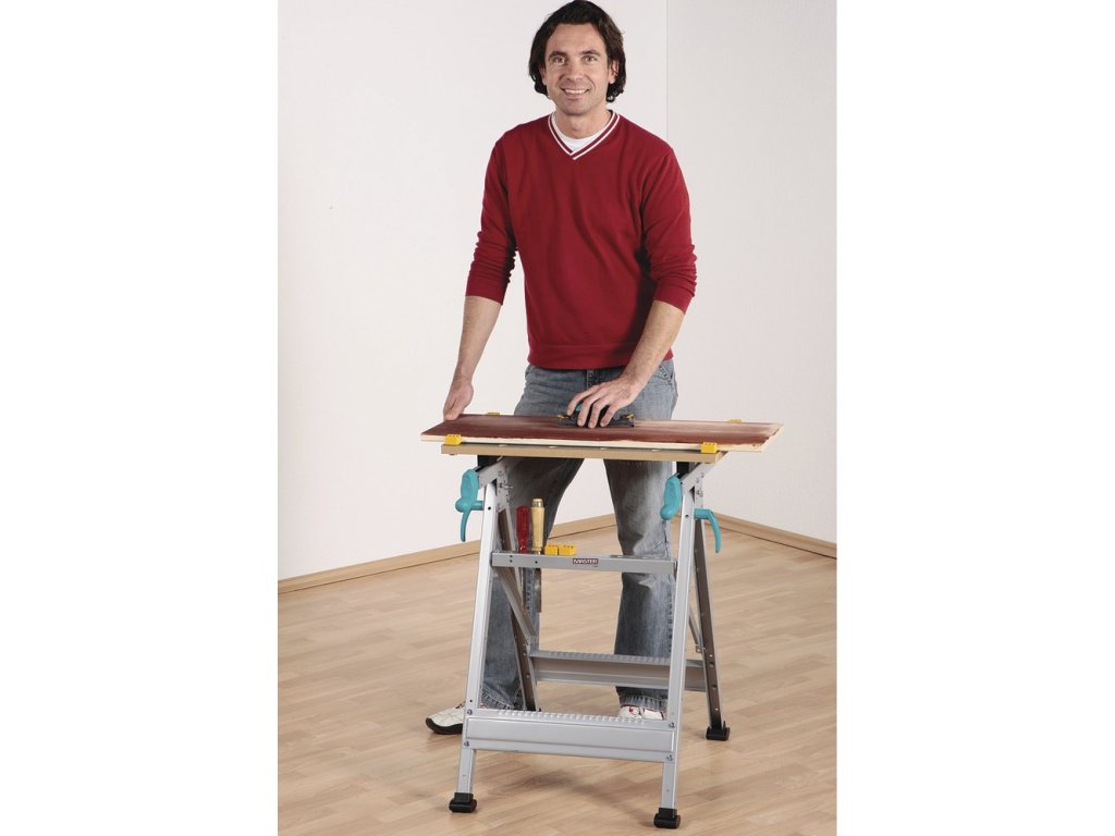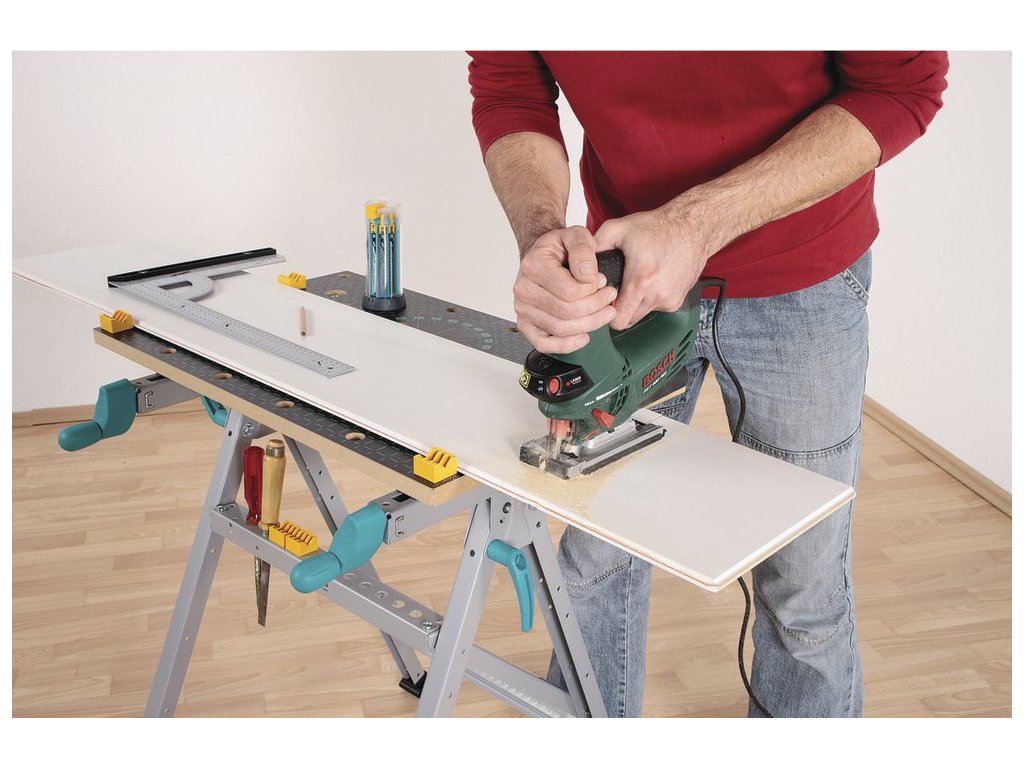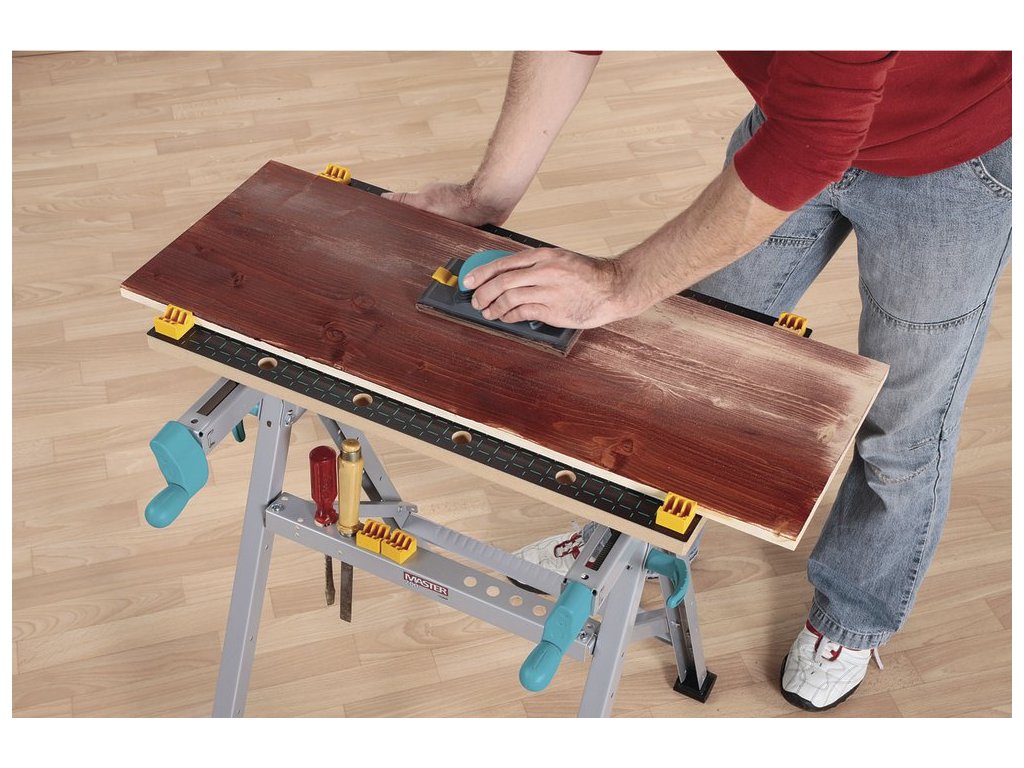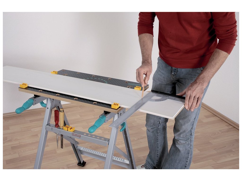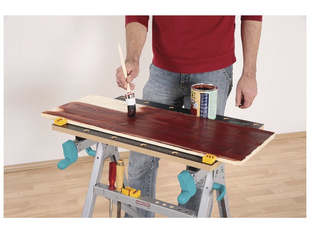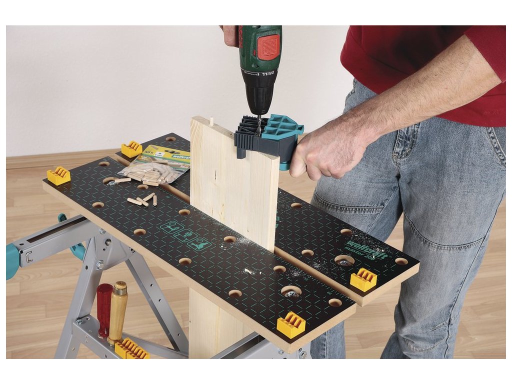 Upínací a pracovní stůl, vysoká úroveň stability, MDF deska, 2 upínací desky, 2 kličky, odkládací plocha pro nářadí, 4 umělohmotné čelisti pro ploché upínání, sklápění pro snadnou skladovatelnost, zatížení max. 180 kg
