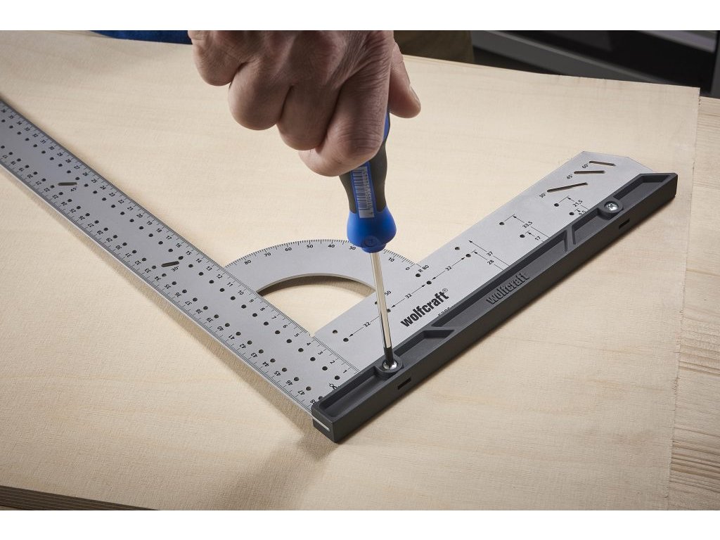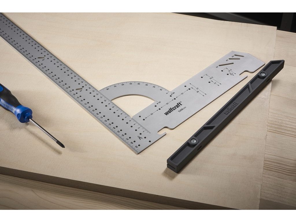 Univerzálny úholník na meranie, ryskovanie, značenie a vedené rezanie.