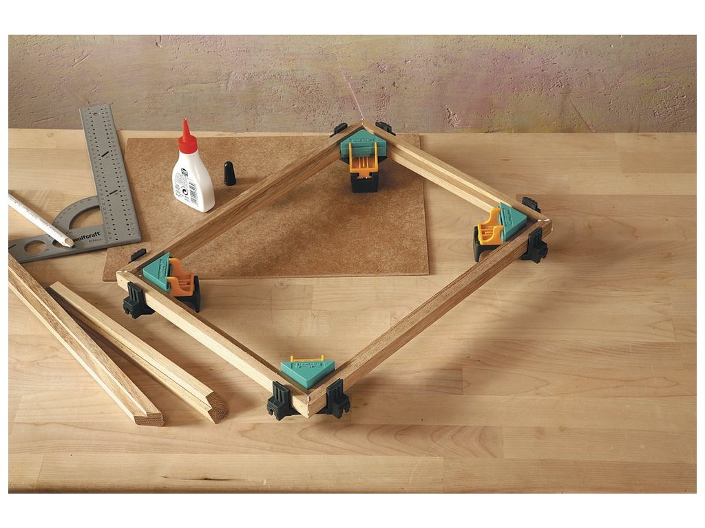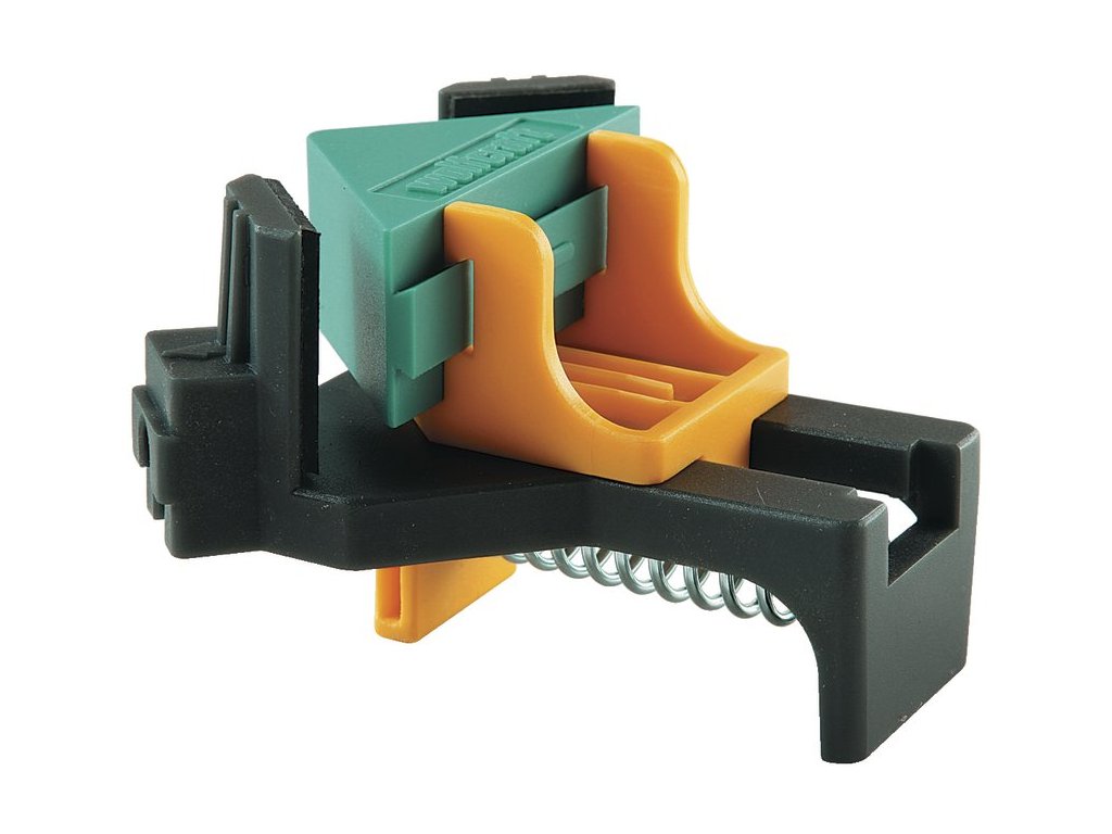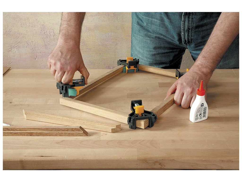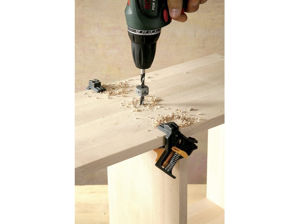 K jednoduchému a rýchlemu fixovanie dosiek a rámov v uhle 90 ° napr. Pri stavbe regálov, skriniek alebo rámov, fixovací pomôcka pri skrutkovanie alebo glejenie, pre rohové a T spájanie, tiež pri rozdielnych šírkach dosiek, pre šírku dosky 10 - 22 mm, jednoručné obsloha - druhá ruka voľná pre materiál