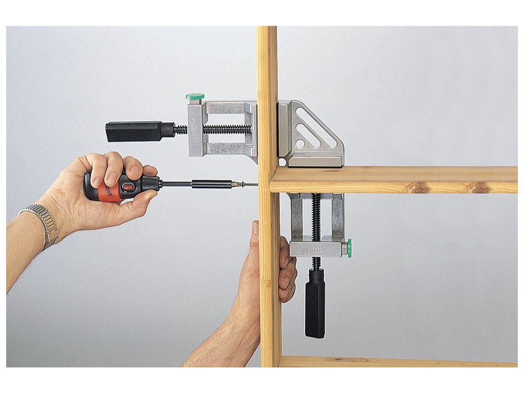 Uhlový zverák – rohový upínač je univerzálna montážna pomôcka, ktorá umožňuje rýchle upnutie v uhle 90°. Dá sa použiť ako upínacie zariadenie, vedenie píly alebo zverák – ideálny na pribíjanie klincov, zváranie a skrutkovanie. Dve upínacie čeľuste umiestnené v pravom uhle zabezpečujú spoľahlivý uhlový rozmer 90°, čo je obzvlášť výhodné pri vyrovnávaní a držaní dielov pri výrobe nábytku. Vďaka integrovanému vedeniu môžete ručnou pílou robiť presné úkosové rezy pod uhlom 45°.